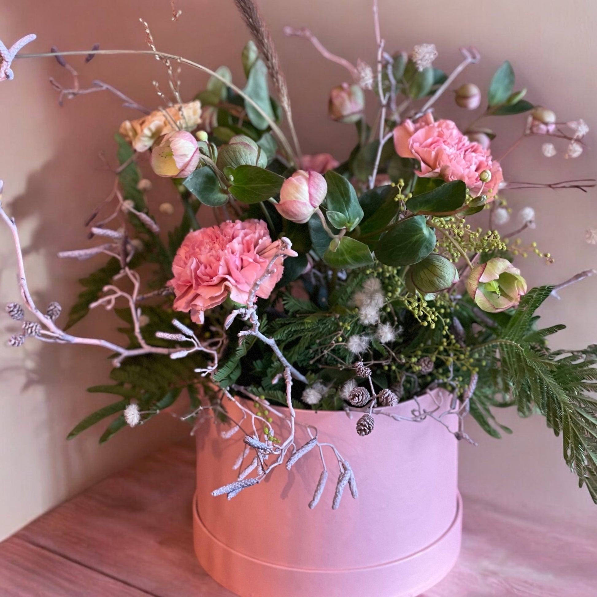 Dekorasjon i eske. Perfekt til bursdag eller andre anledninger. Kommer i 3 størrelser. Dersom man ønsker andre farger så kan dette endres. Blomster varierer i sesong og kan derfor være noe annerledes enn på bildet. Dekorasjonen på bildet er medium størrelse.