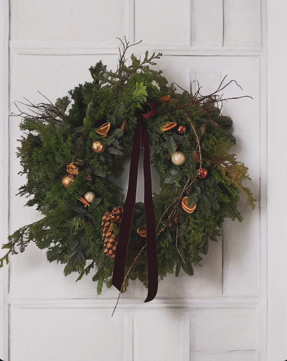 Med kuler, kongler og pynt. Eksklusiv grøntmateriale.