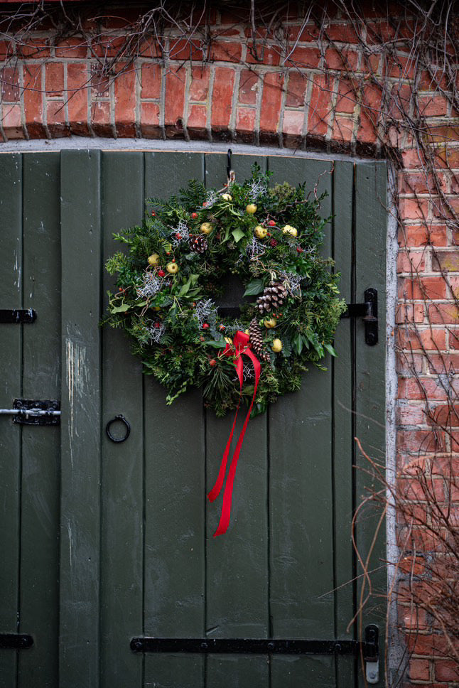 Vi bruker kun lokalt høstede materialer – gran, einer, frøkapsler, kvister og vintergrønt fra gården – kombinert med eksklusive silkebånd og pynt som gir et raffinert helhetsuttrykk.