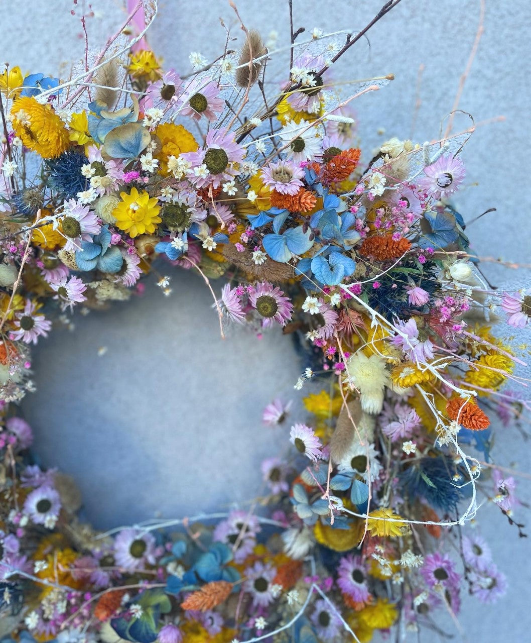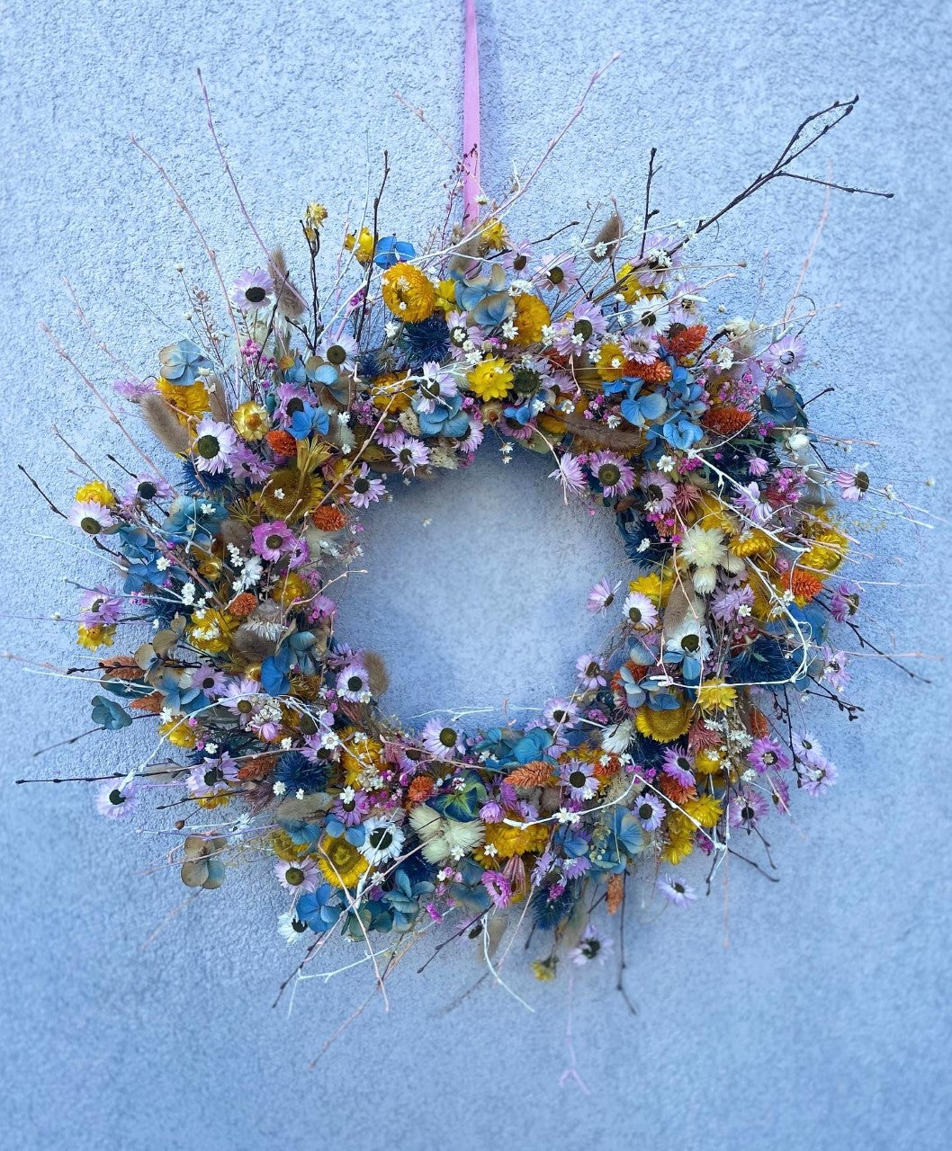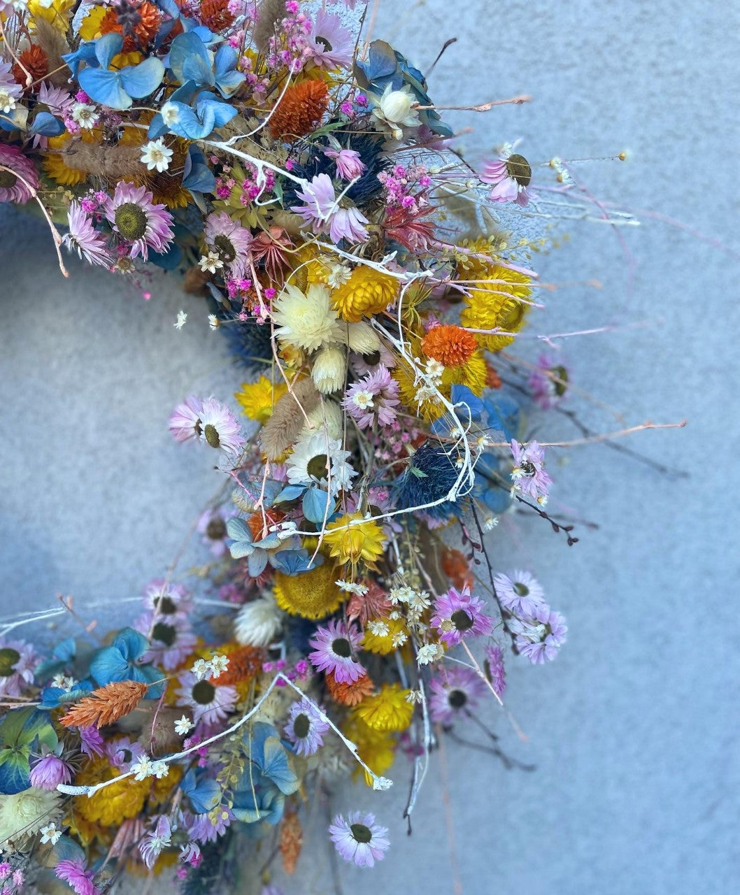 Stor tørket blomsterkrans i glade farger ca 50 cm.