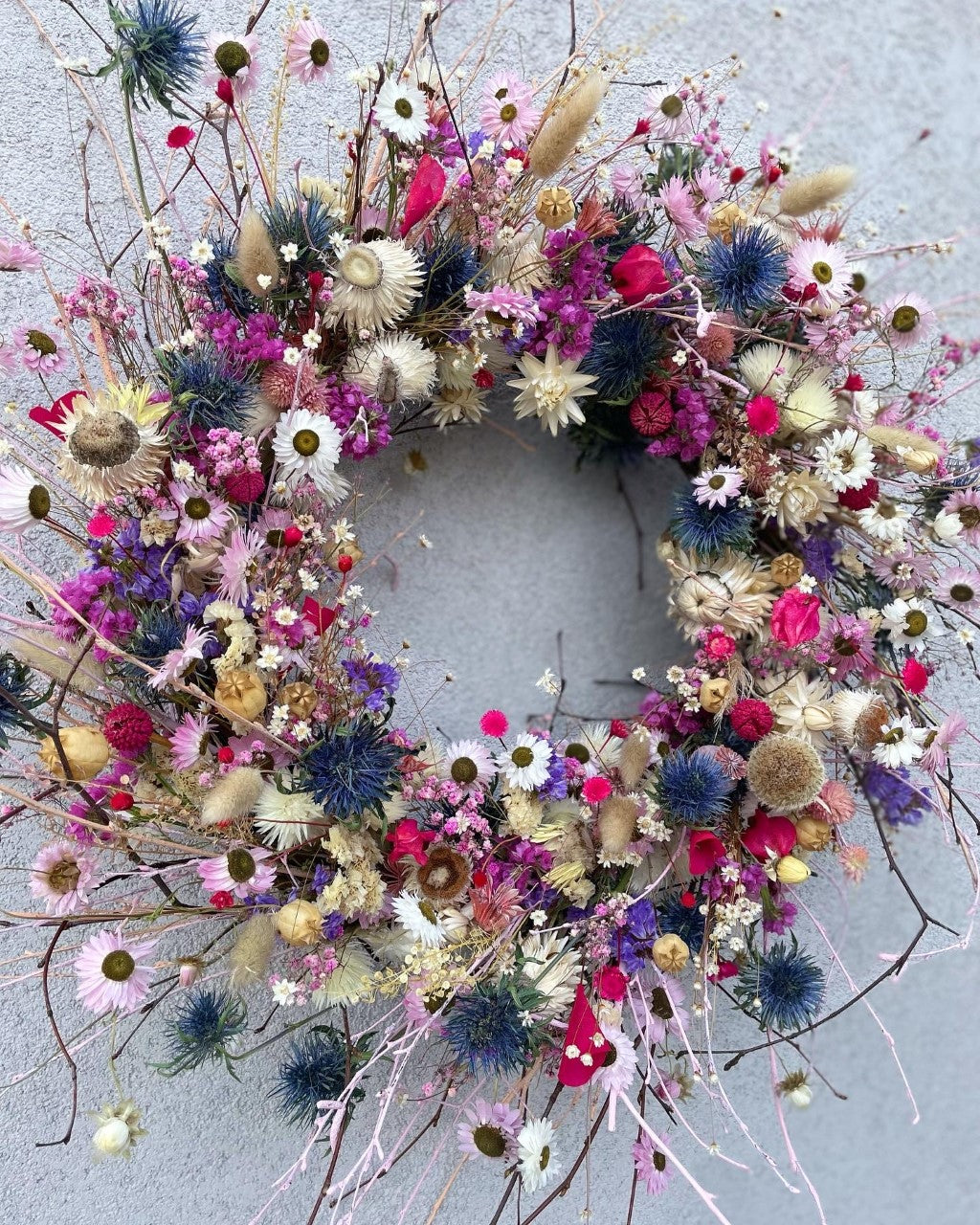 Stor tørket blomsterkrans i rosatoner. ca 45 cm.